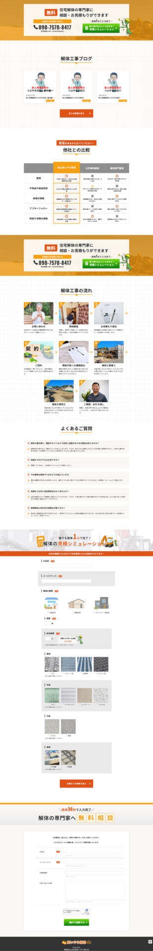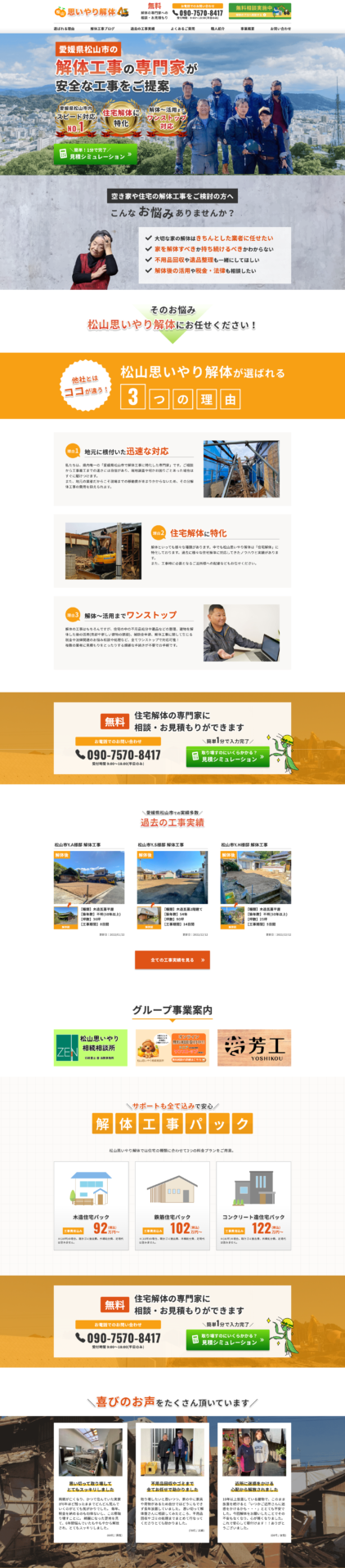地域密着で、自分の大事な実家を解体するため、どんな人が担当してくれるのか目にわかって安心感と親近感を与えられるようにオレンジを基調として人気を出すデザインにしました。